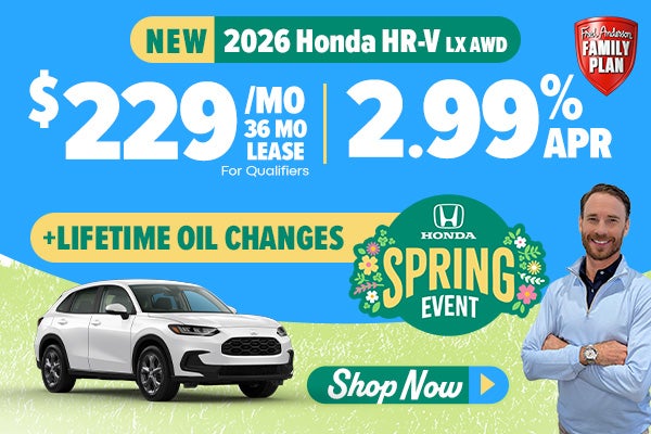 Vehicle shown for illustration purposes only; Lease MY26 HR-V FWD LX CVT, VIN 3CZRZ1H36TM732372, MSRP $28105, $4599 due at lease signing includes down payment and $229 1st month payment for 36-month closed-end lease with approved credit through HFS. $0 security deposit is required. Lessee responsible for maintenance, repairs, excessive wear and tear, and excess mileage over 10000 miles/year at the rate of $0.20/mile. Early lease termination fee may apply. Price does not include insurance, Infrastructure Maintenance Fee of $500, SCDMV tag and title fees, or dealer closing fee of $499. Lease payments/due at signing calculated with $500 Loyalty or Conquest award toward the cap cost reduction or down payment assistance (must be current owners of any 2011 or newer Honda, Chevrolet, Ford, Hyundai, Jeep, Kia, Mazda, Nissan, Subaru, Tesla, Toyota and Volkswagen vehicle to qualify). Total monthly payments are $8244. Residual $18,167.50. 2.99% APR valid with approved HFS credit for qualified customers up to 60 months based on $17.96/$1,000 financed, down payment varies; Offer Expires: 04/30/2026. *Per AHM New Car Sales for 2025