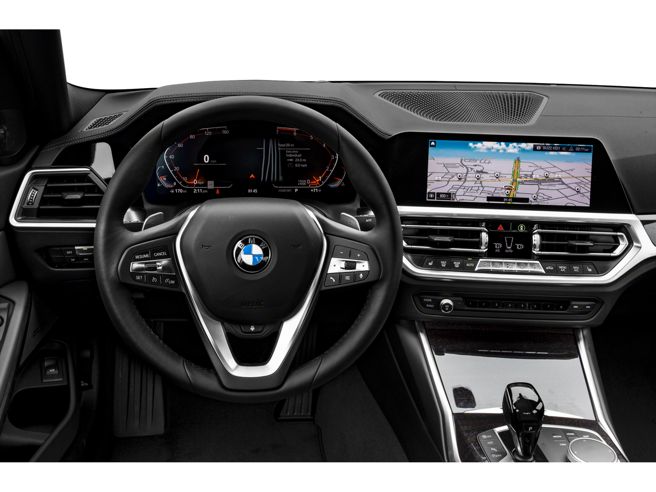 Comfort and style converge in this 3 Series, with features like Heated Front Seats, Power Front Seats, and SensaTec Upholstery ensuring a refined and relaxing driving experience. The Sport Seats and Leather-Wrapped Steering Wheel further enhance the driver-focused cockpit, while the Genuine Wood accents lend an air of sophisticated elegance.